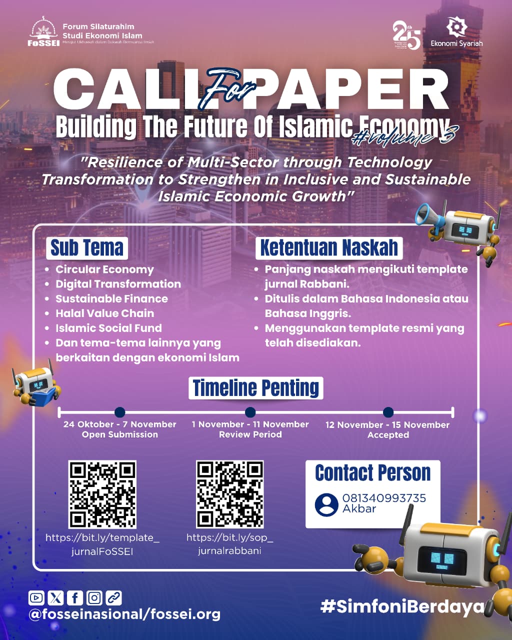 Forum Silaturahim Studi Ekonomi Islam (FoSSEI) dengan bangga membuka kesempatan bagi seluruh akademisi, mahasiswa, dan peneliti untuk berkontribusi dalam pengembangan ekonomi Islam melalui kegiatan Call for Paper: Building The Future of Islamic Economy Volume 3.